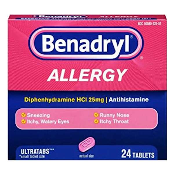 Each tablet contains 25 milligrams of the antihistamine diphenhydramine HCI to temporarily relieve allergy symptoms like sneezing, runny nose, itchy throat and nose, and itchy, watery eyes and the common cold symptoms of runny nose and sneezing. Benadryl Allergy UltraTabs Tablets are intended for adults and children ages six and up.